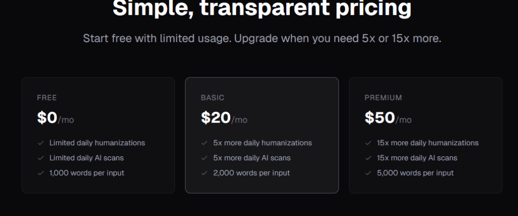 | Undetectable AI | Humanized rewriting | Paid plans vary | Naturalized AI content |